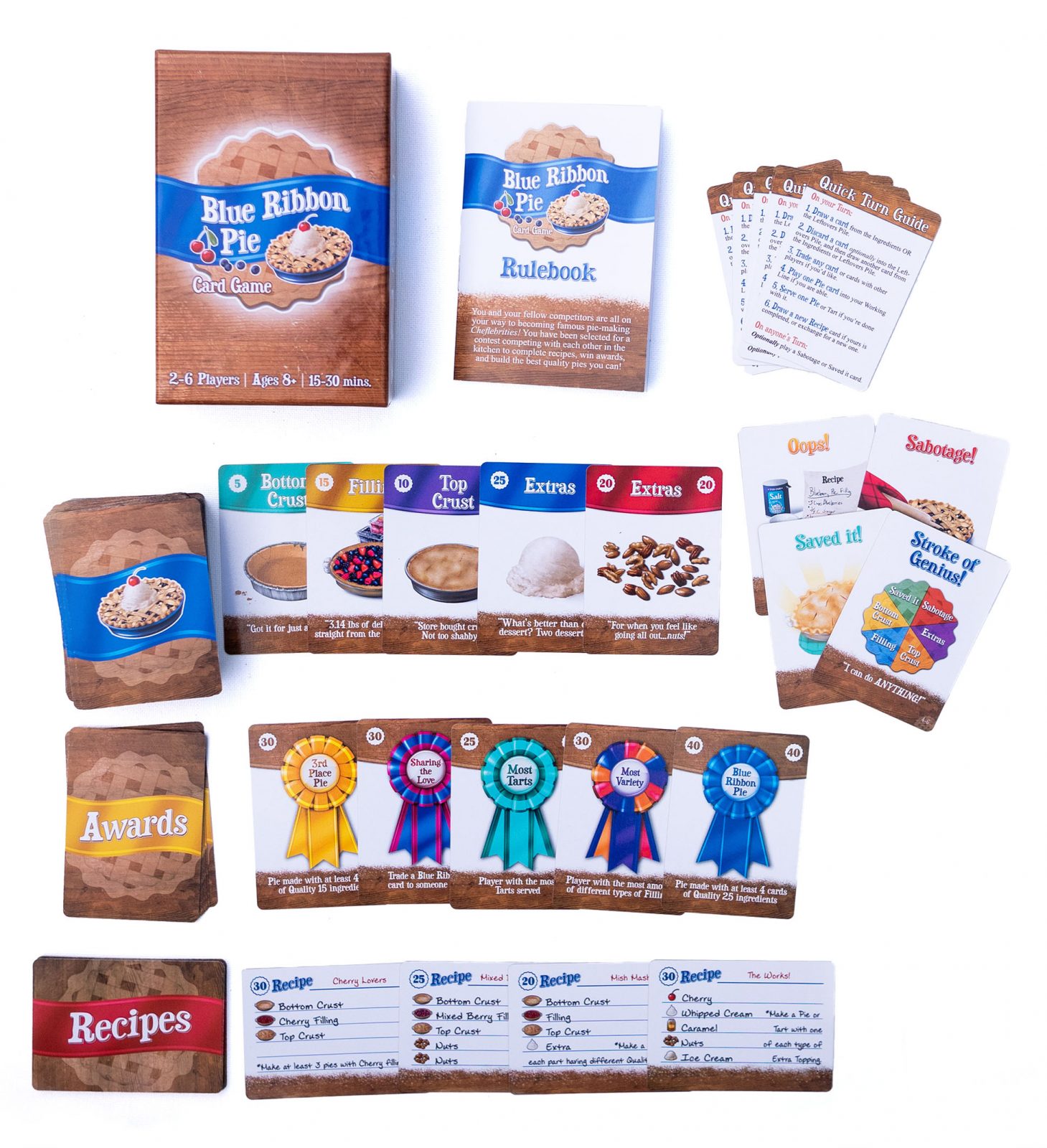 Blue Ribbon Pie is a fun, casual, family card game! You take turns drawing cards from the ingredients pile, playing a card on your turn, and putting together the best quality pies you can! But watch out, mistakes can be made and people can sabotage each other in the kitchen with special cards. Points are tallied up at the end based on quality and special conditions to find out who the winner is!